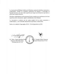 Este organismo constará de miembros numerarios y colaboradores y entre sus fines están “fomentar la investigación bíblica, proporcionar oportunidades a los biblistas hondureños y extranjeros residentes para su ulterior especialización, estimular y mantener, respetando la competencia de otras instituciones análogas, el contacto centre los biblistas que puedan estar en el país, ser punto de encuentro para todos aquellos que hacen de la Palabra de Dios el objeto predominante de su estudio religioso y su actividad apostólica y relacionarse, con espíritu ecuménico, con biblistas no católicos”.
