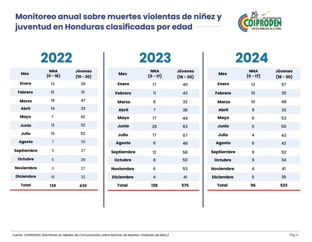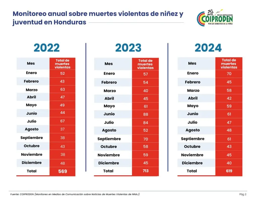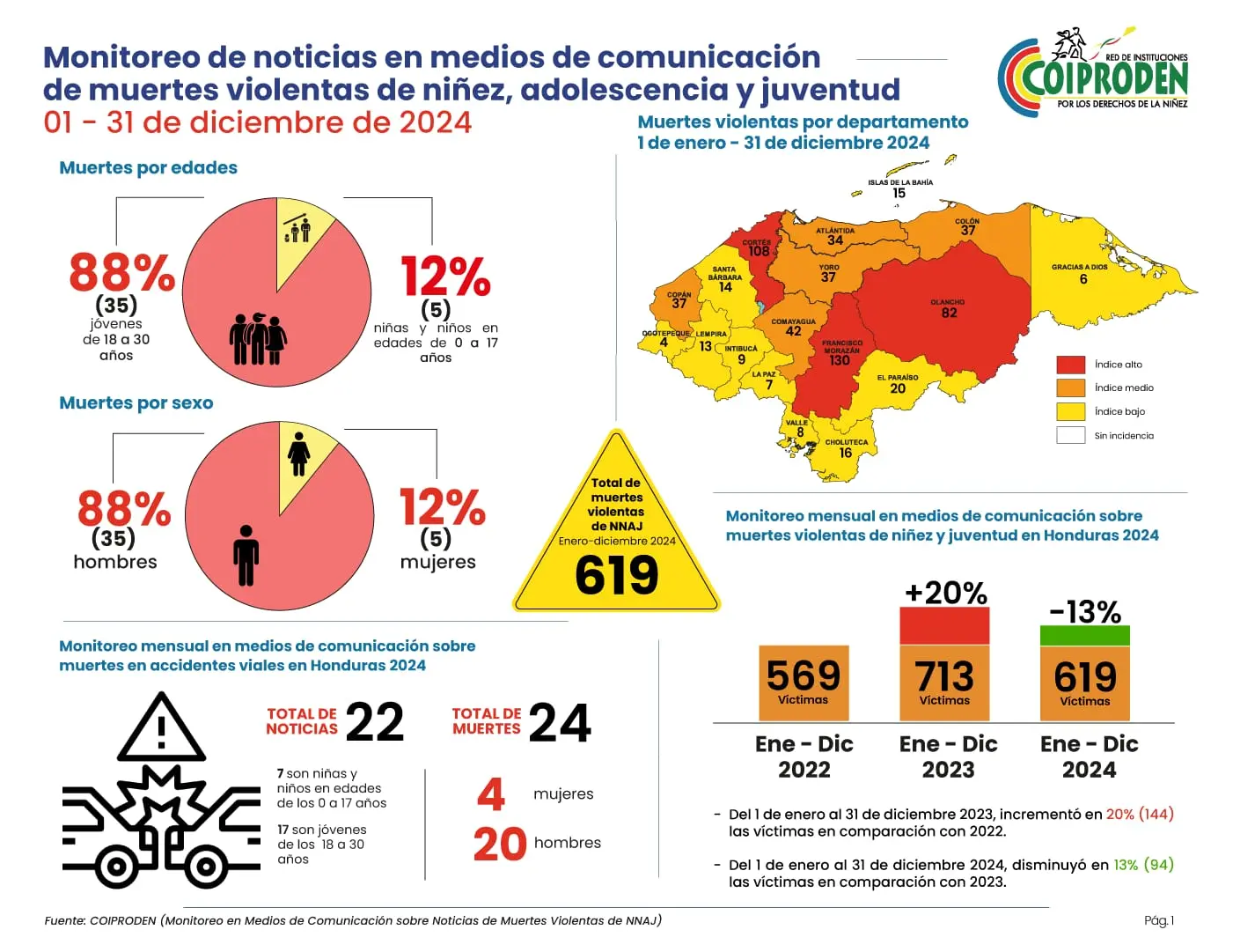 Del 1 de enero al 31 de diciembre del año 2024, se registraron 619 víctimas lo que refleja que en promedio de más 50 NNAJ están perdiendo la vida al mes, producto de la violencia en nuestro país. Los departamentos con más hechos violentos registrados son Francisco Morazán, Cortés y Olancho.